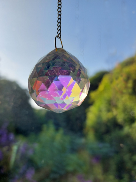 Onderaan hangt een prachtige grote kristalbol die door het opvangen van het zonlicht