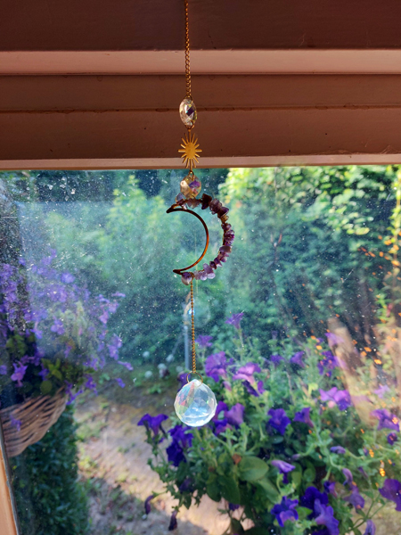 Zeer mooie raamhanger uit verschillende soorten kristalglas verwerkt als maan met Amethist.