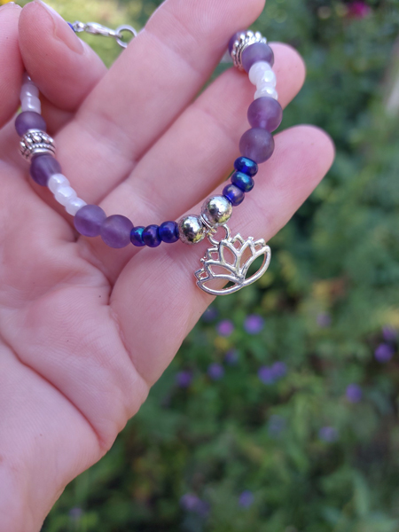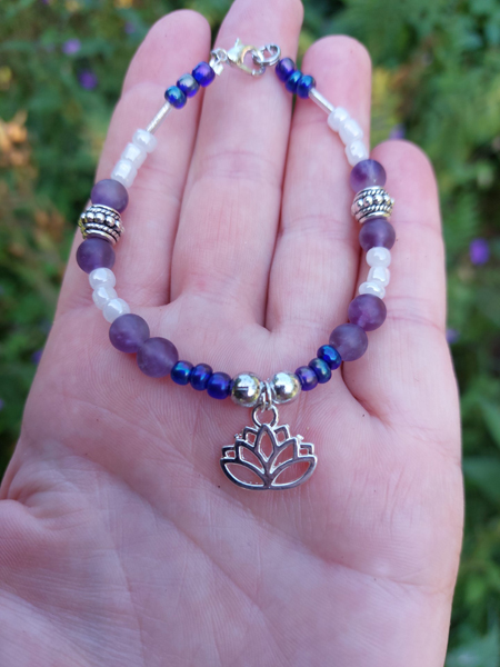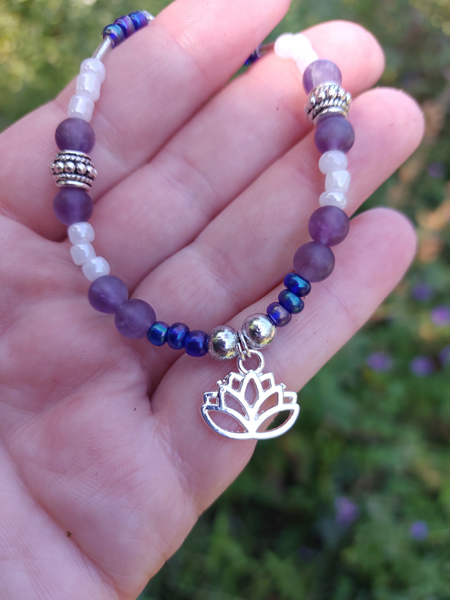 Mooie handgevaardigde armband met kralen, amethist edelstenen met lotusbloem bedel verwerkt.