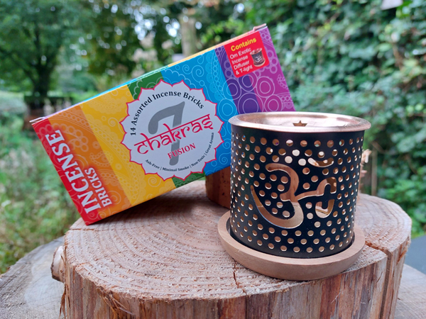 1 Diffuser met een Ohm teken + 7 zakjes A 2 wierookblokjes per zakje.