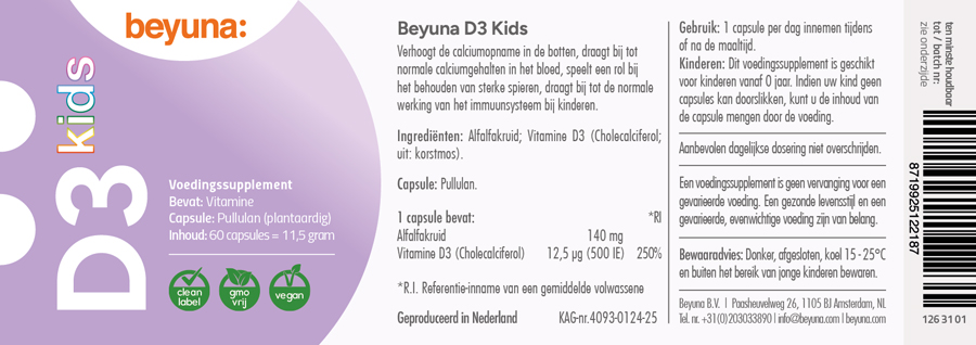 Beyuna – D3 voor kids, ondersteunt de botten van kinderen, draagt bij aan een sterk gebit met natuurlijke ingrediënten