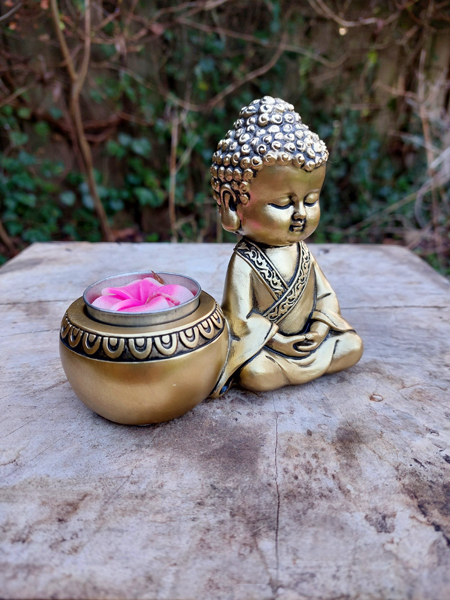 Boeddha met de handen ontspannen in de schoot met kaarsenbakje, een bijzondere