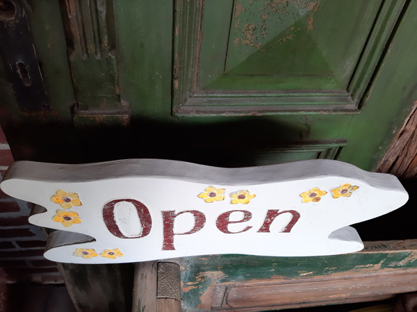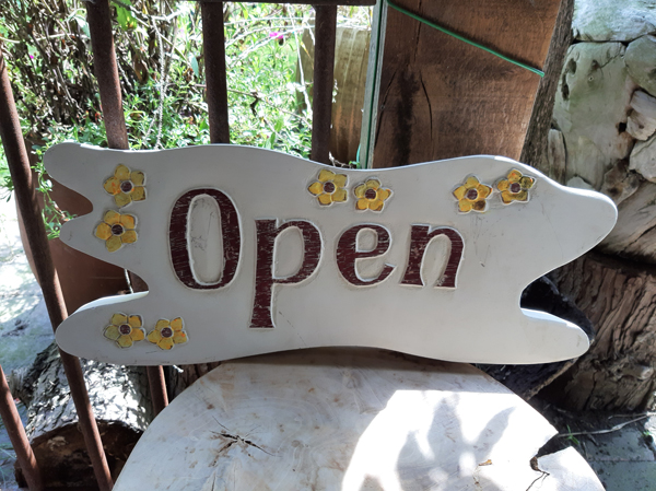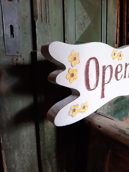 Bord / naambord / deur bord / winkel bord met ” open ” erop verwerkt met leelawadee bloemetjes, handgemaakt