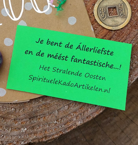 geluksmunt uit brons met gelukssteen, alles gezellig verpakt met het groene kaartje met tekst.