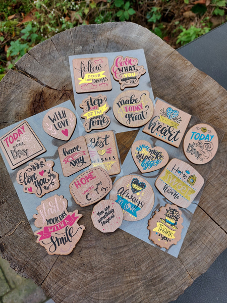 Dit stevige houtje is een grote sticker, verwerkt met mooi opschrift met glimmende details.