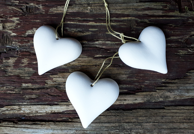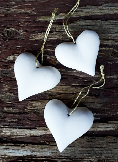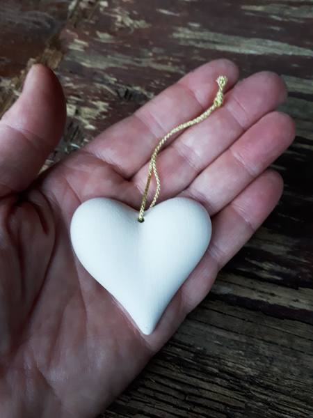Hangende geursteen / aromasteen als hart in wit, verspreid een essentiële / etherische olie door een ruimte heen, ook gemakkelijk in de auto aan de binnenspiegel