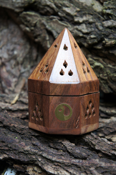 Kegel wierook brander uit hout, gemakkelijke en veilige brander ingelegd met bronzen symbolen