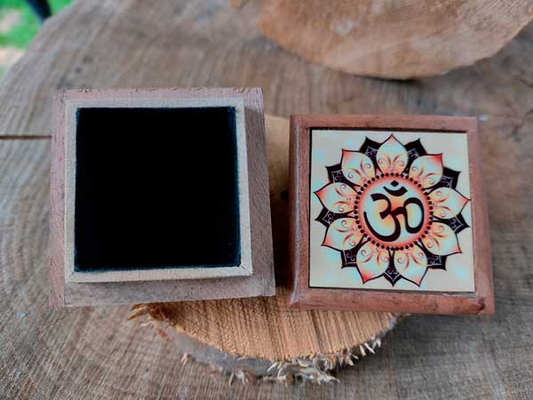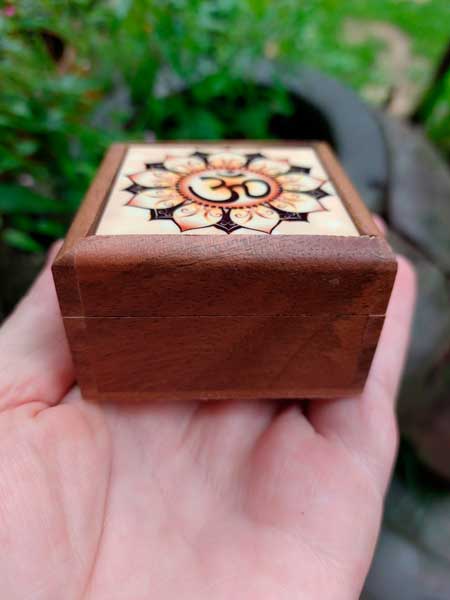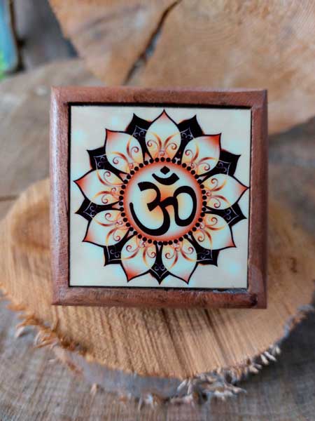 Kistje uit hout met liefde met de hand gemaakt met Ohm symbool in een lotusbloem