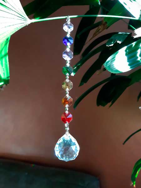 Zeer mooie raamhanger uit kristalglas met alle de chakra kleuren.