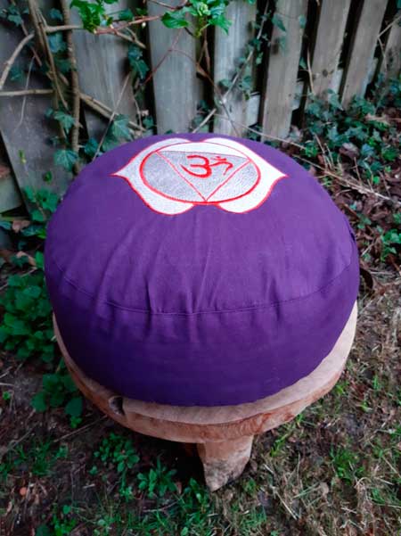 Meditatie kussen paars met Ohm symbool + gratis wierook + affirmaties + extra boekweit dopjes