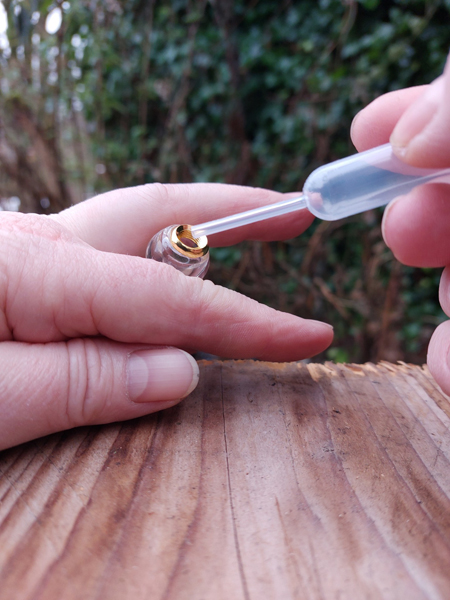 Met meegeleverd pipetje wat opknijpen en de hanger ermee vullen.