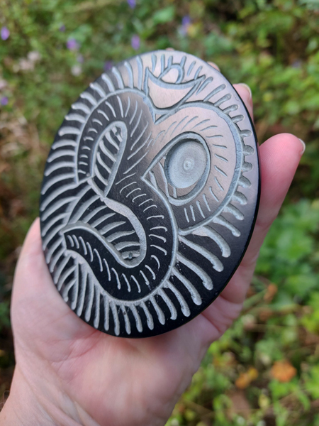 Wierook brander uit saponiet steen, handgemaakt met een Ohm symbool + 2 kokers wierook