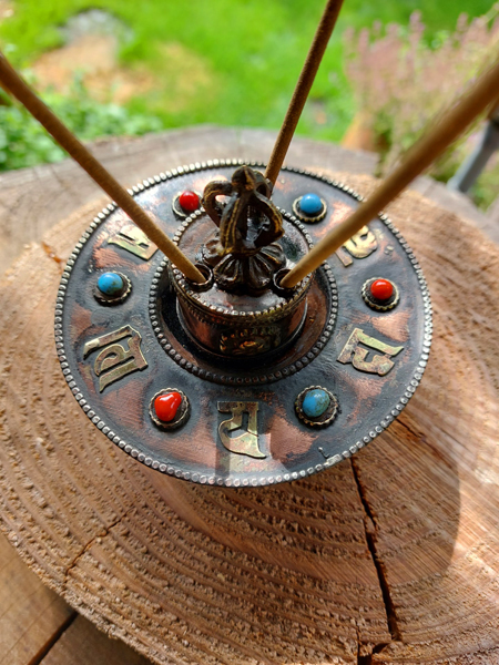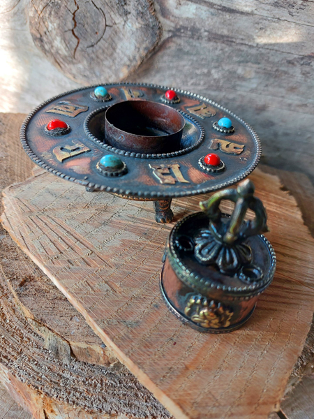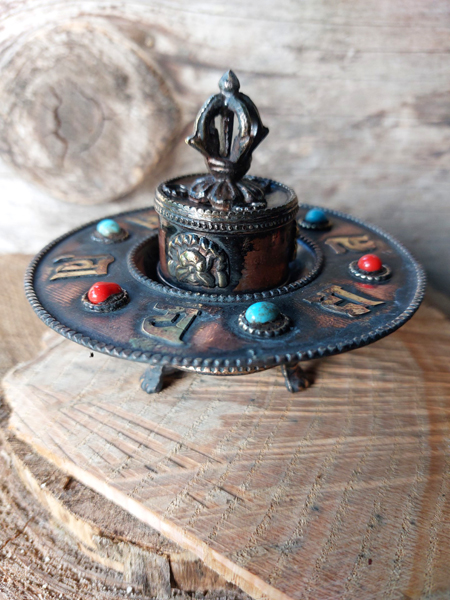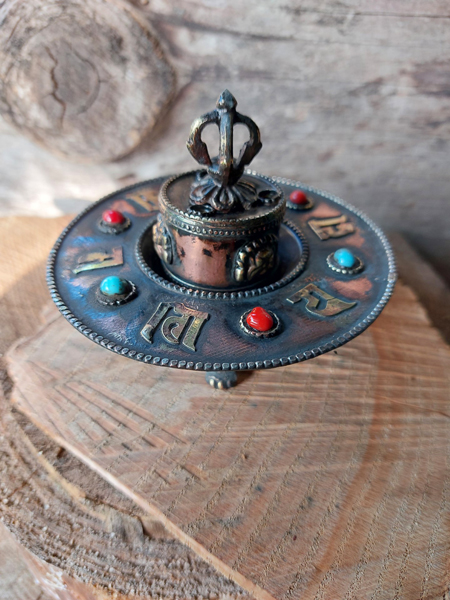 Wierook- salie- kegel- brander uit koper met Dorje en verwerkt met mineralen en edelstenen + GRATIS 3 kokers wierook